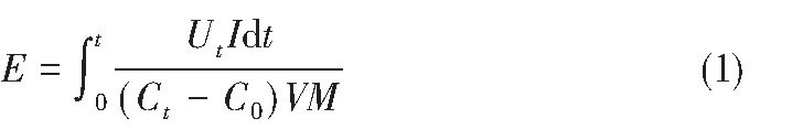 能耗是雙很膜電滲析過程的一個重要指標。本實驗中, 雙很膜產生的OH-部分參與PFS的制備, 很難測定OH-的產生總量。因此, 能耗E (kW·h/kg H2SO4) 的計算基準為雙很膜產生的H+量, 具體計算如式 (1) 。